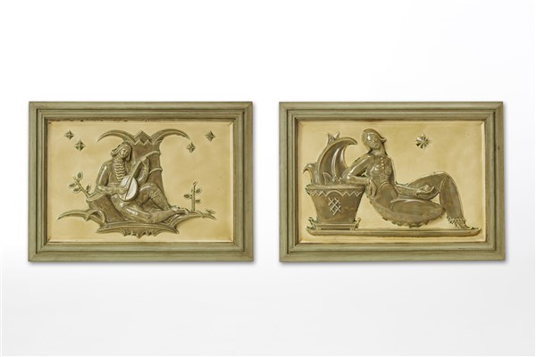 Due pannelli in maiolica di gusto Jugnedstil, decorati con figure a rilievo smaltate in grigio-verde su fondo crème sotto vetrina. Anni '20. Numerali n. 2404a/n. 2404b incussi al verso, Dek 4024d in grafite al verso di una (cm 44x29). In cornice.