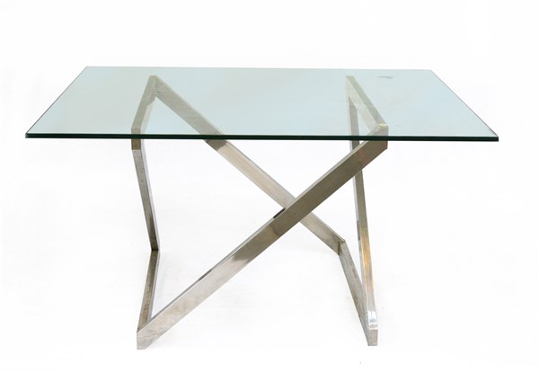 Tavolo con struttura in ottone cromato e piano in cristallo di forte spessore fumè. Italia, anni '70. (cm 140x75x105) (gravi difetti)