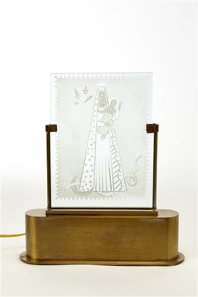 Lampada da tavolo composta da un basamento in lastra d'ottone reggente una lastra di cristallo di forte spessore, incisa con figura di Madonna con Bambino. Milano, anni '20/'30. (cm 27x30x7)