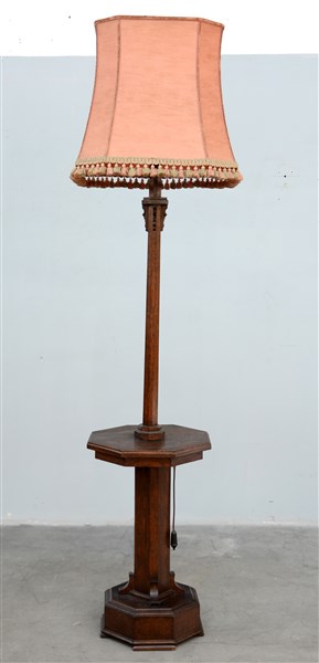 Lampada da terra in rovere con sostegno squadrato, base e ripiano portaoggetti ottagonali. Milano, 1920ca. (h cm 190) (difetti)