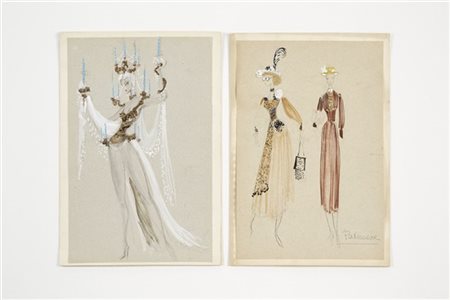 Coppia di bozzetti per costumi teatrali. Roma, anni '50. Tecnica mista su carta incollata su cartoncino recante schizzi e iscritto al verso. (cm 45,5x30) (lievi difetti)