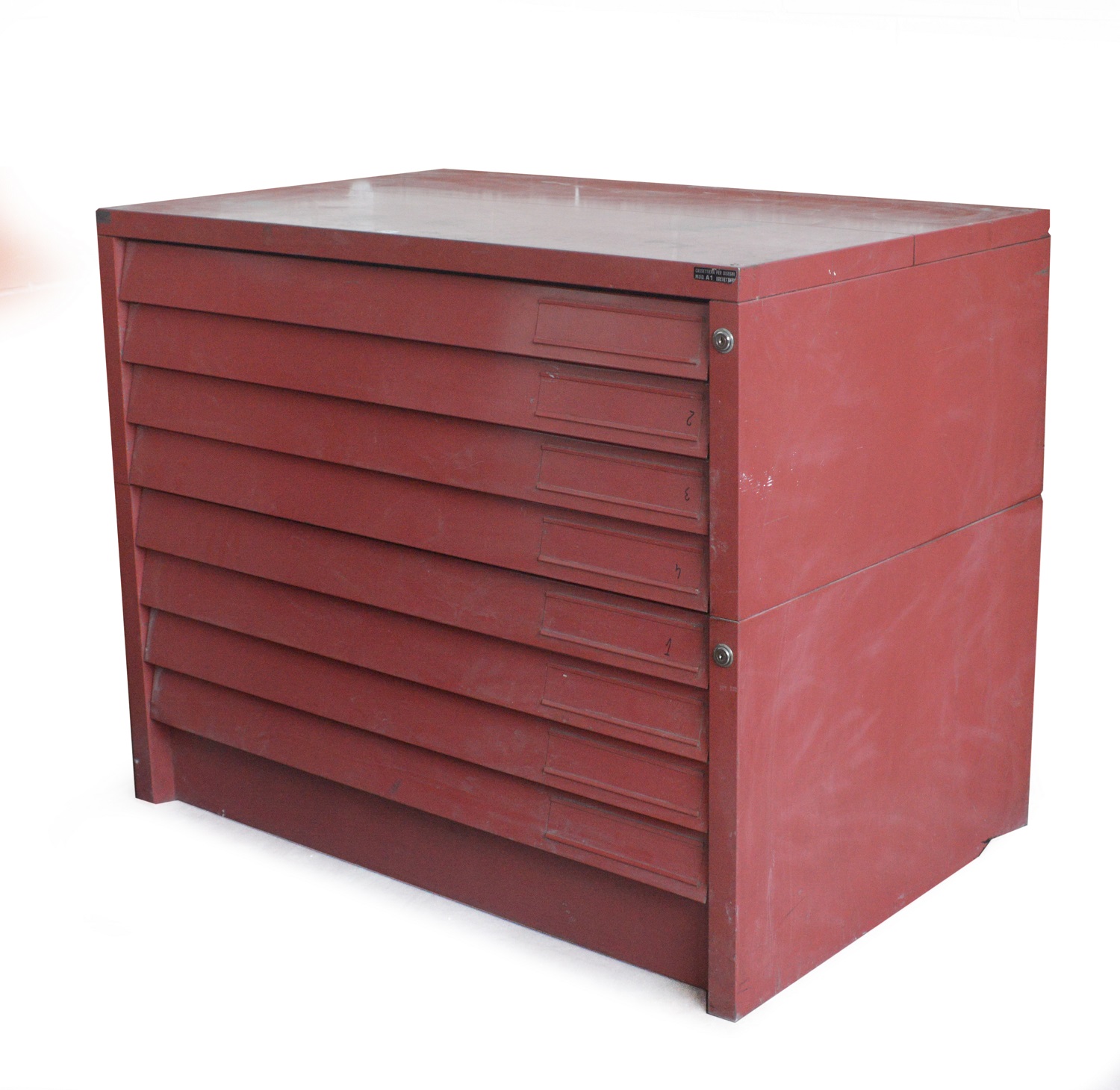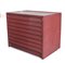 Cassettiera per disegni a otto cassetti in metallo verniciato rosso. Italia, an