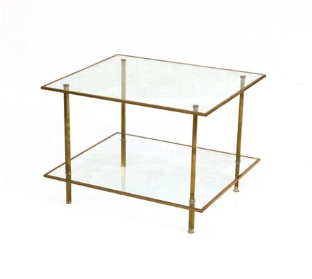 Tavolino da salotto a due ripiani con struttura in ottone e ripiani in cristallo. Italia, anni '70. (cm 60x50x60) (lievi difetti)