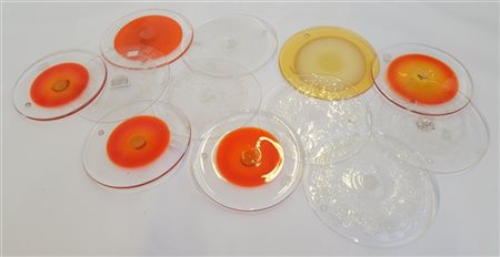 Dodici dischi per lampada a sospensione in vetro soffiato di diversi colori. Italia, anni '70. (Misure diverse)