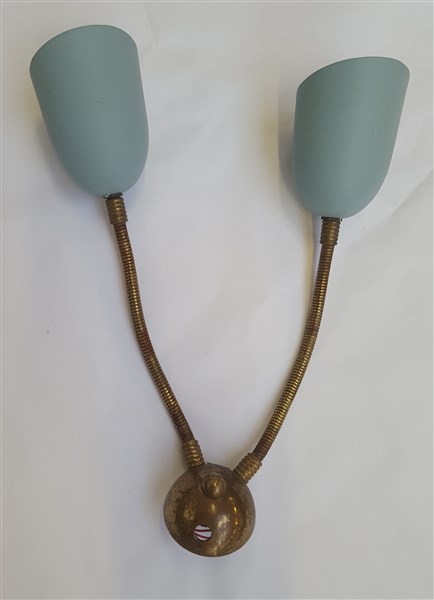 Applique a due luci in ottone e alluminio verniciato azzurro. Italia, anni '50. (h cm 35) (lievi difetti)