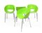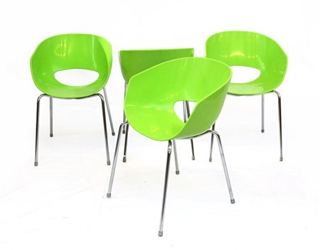 Lotto composto da quattro poltroncine verdi modello "Orbit". Produzione Sintesi, Italia, 2002. Tecnopolimero standard, tubo d'acciaio. (cm 57x81x48)