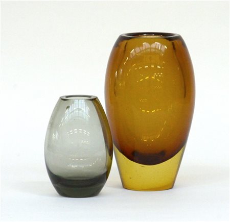 Lotto composto da due vasi di forma ovoidale in vetro massello ambrato e fumè, uno di produzione nord-europea e l'altro di produzione muranese. Anni '90. Il minore firmato e numerato a punta sotto la base. (h cm 26 e h cm 16,5)