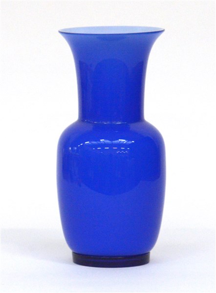 Vaso a balaustro della serie "Opalini". Murano, 1986. Vetro incamiciato blu lattimo. Disegno n° 706.38 del catalogo verde. Firmato a punta sotto la base "Venini 86". (h cm 29)