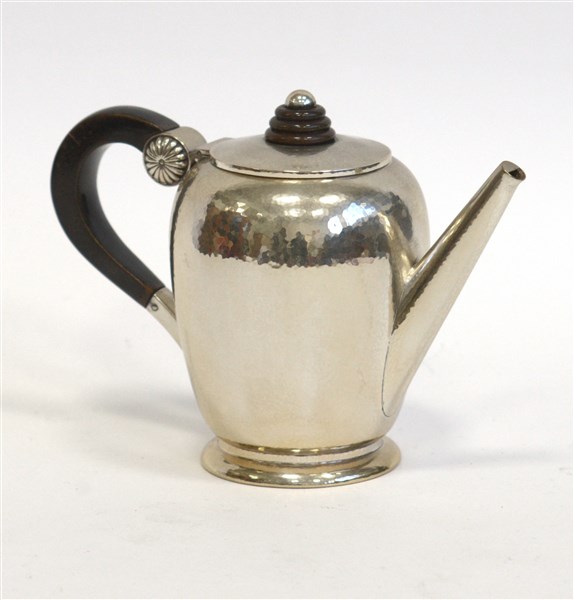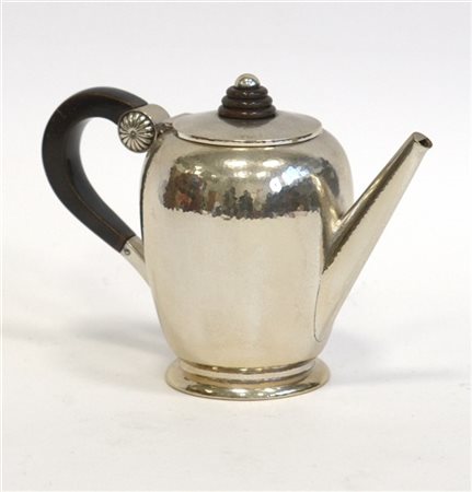 Caffettiera déco in argento martellato con presa del coperchio in legno, manico in legno sagomato decorato all'attacco da rosoni. Italia, secolo XX. Titolo 800. (g lordi 620 ca,) (h cm 17) (lievi difetti)