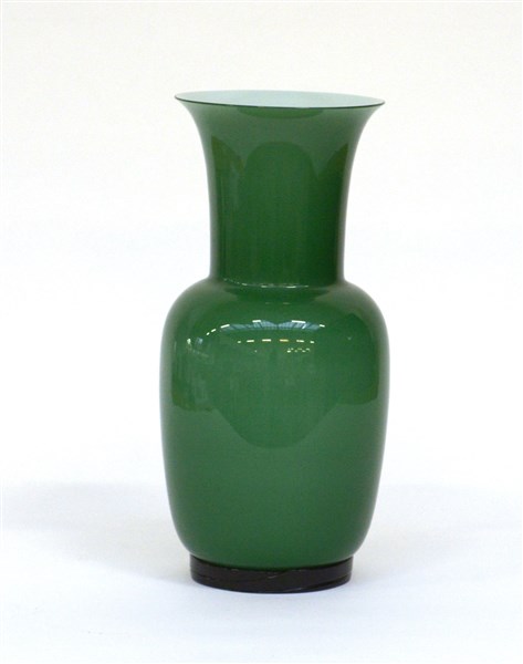 Vaso a balaustro della serie "Opalini". Murano, 1981. Vetro incamiciato verde lattimo. Disegno n° 706.22 del catalogo verde. Firmato a punta sotto la base "Venini italia 81". (h cm 36)