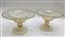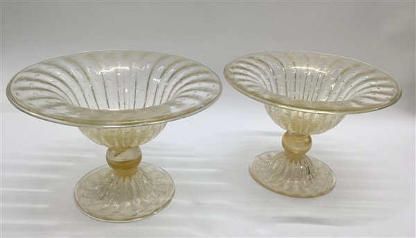 Coppia di alzate in vetro soffiato incolore costolato, con inclusione di bolle e foglia d'oro. Secolo XX. (h cm 26; d cm 41)