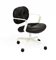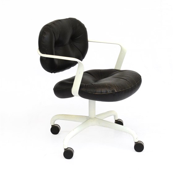 Sedia a rotelle. Produzione Knoll International, USA, 1974. Metallo verniciato bianco e seduta e schienale rivestiti in pelle nera. Marcata sotto la seduta e recante etichetta adesiva. (cm 61x76x62) (difetti)