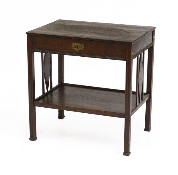 Tavolino da centro in rovere con cassetto sottopiano, pianetto intermedio e gambe squadrate, decorato con pannelli a rombo e maniglie in fusione metallica. Milano, 1920ca. (cm 68x71x49) (difetti)