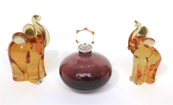 Lotto composto da due elefantini in vetro ambrato recanti etichetta Nason e un portaprofumo firmato Venini. Italia, secolo XX. (Misure diverse) (lievi difetti e mancanze)