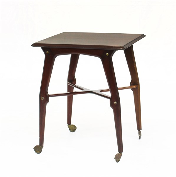 Tavolino su ruote in legno massello con piano quadrato a quattro gambe sagomate riunite da traverse. Italia, anni '50. (cm 68x80x68) (difetti)