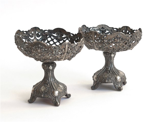 Coppia di alzate in argento cesellato e traforato (g 500 ca.) (difetti)