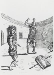 Giorgio de Chirico Volos 1888 - Roma 1978 Gladiatori nell'arena, 1969 Litografia, es. 10/90, cm. 50,5x40,5 (lastra), cm. 71,5x50,5 (carta) Firma a matita sul margine in basso a destra: G. de Chi- rico, tiratura in basso a sinistra: 10/90, titolo al centro: "I gladiatori", timbro a secco GdeC. Al verso: etichetta con certificato di garanzia Edizioni Bora. Tiratura di 90 esemplari numerati da 1/90 a 90/90, 10 prove d'artista. Bibliografia: Alfonso Ciranna, Giorgio de Chirico, ca- talogo delle opere grafiche (incisioni e litografie) 1921- 1969, A. Ciranna Ed. Milano - Ed. La Medusa, Roma, 1969, p. 187, n. 164; Antonio Vastano, Giorgio de Chirico. Catalogo dell'o- pera grafica 1921-1969, Edizioni Bora, Bologna, 1996, p. 255, n. 167.