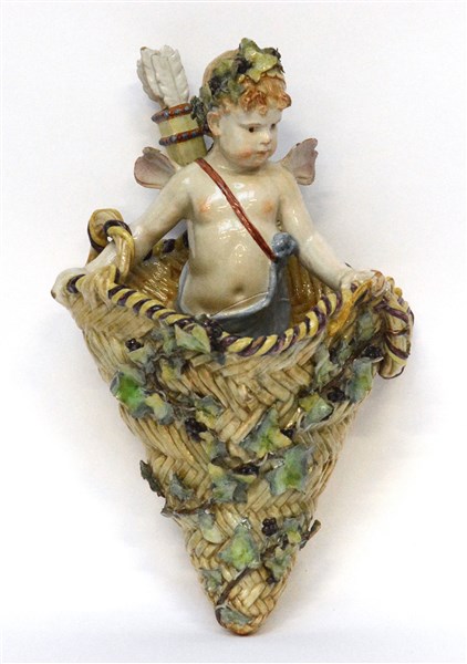 Manifattura di Ginori. Fioriera in ceramica decorata in policromia a tutto tondo ad amorino e grappoli d'uva (h. cm 44) (difetti)