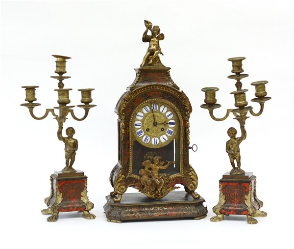 Trittico da camino in stile boulle composto da candelieri a cinque fiamme e pendola, decorato in metallo dorato a fregi e putti