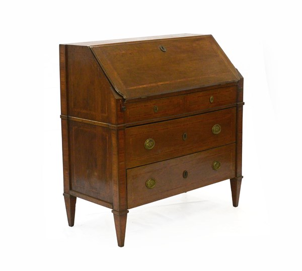 Ribalta lastronata in noce e filettata a quattro cassetti sul fronte e anta ribaltabile celante vani e cassettini (cm 100x107x50) Secolo XIX (difetti)