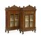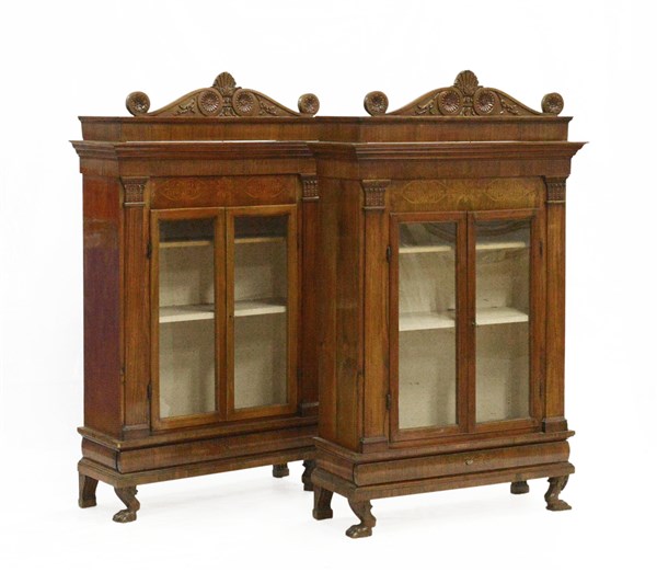 Coppia di vetrine di forma architettonica in legno, fronte a due ante e un cassetto intarsiato a motivi floreali, piedi ferini (cm 86x152x34) Secolo XIX (difetti)