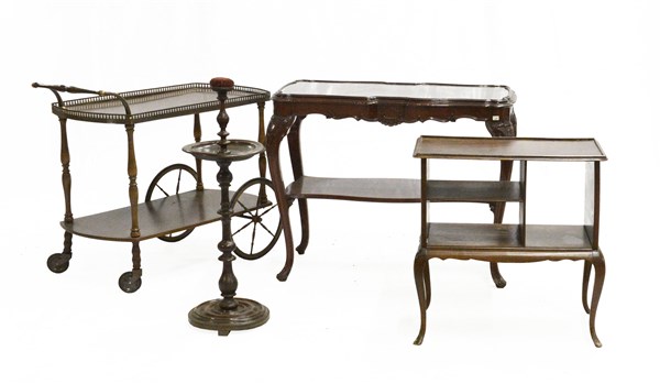 Lotto composto da un tavolino porta cucito, due tavolini a ripiani e un carrello con ghiera e presa in ottone (difetti)