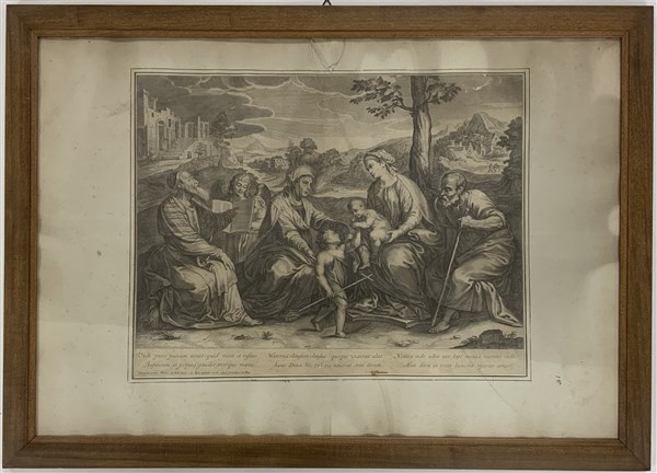 Antica incisione (cm 52x75) raffigurante una scena religiosa con la Sacra Famig