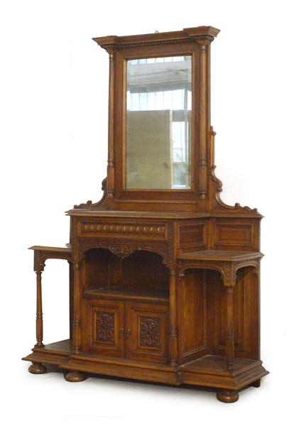Credenza neorinascimentale in legno intagliato, parte inferiore a due ante, vani e cassetto, parte superiore a specchio, montanti a colonna scanalata, piedi torniti (cm 180x270x65 ca.) (difetti)