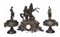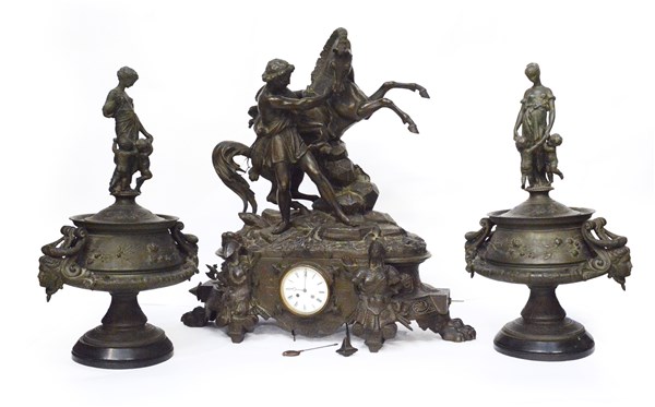 Trittico in metallo composto da orologio sormontato da figura con cavallo e due vasi decorati a figure allegoriche a tutto tondo