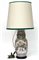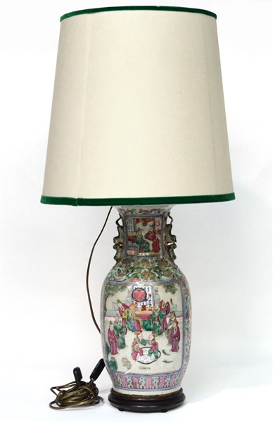 Grande vaso in porcellana Famiglia Rosa Cantonese decorato con scene di vita di corte (h cm 50) con base in legno. Cina, fine del secolo XIX, montato a luce elettrica (difetti)