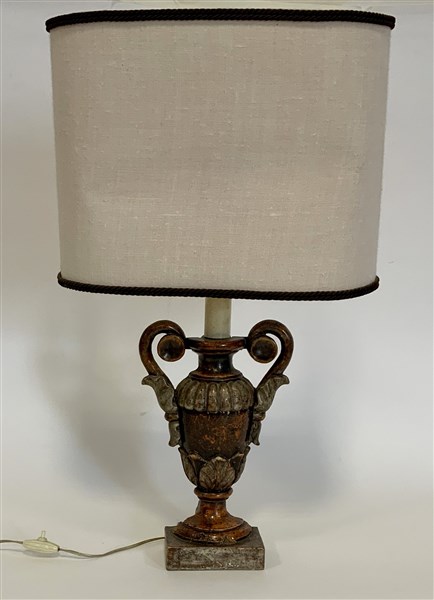 Portapalme biansato in legno laccato. Secolo XIX. Montato a luce elettrica in epoca posteriore (h. cm 33) (difetti e mancanze)