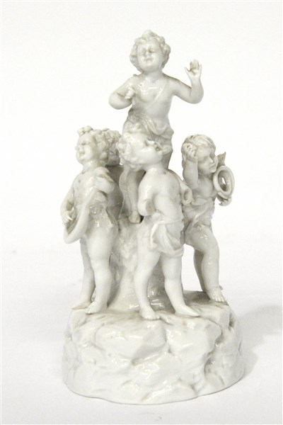 Manifattura del secolo XX "Putti musicanti" gruppo in porcellana bianca (h cm 17,5) (difetti e mancanze)