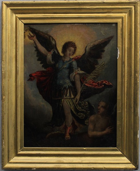 Ignoto "Arcangelo Michele con satana" olio su rame (cm 22x16) In cornice (difetti e restauri)