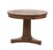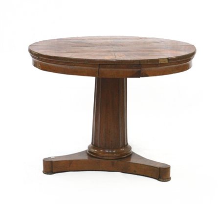 Tavolo lastronato in noce con piano tondo a due cassetti nella fascia, sostegno centrale a colonna sfaccettata. Secolo XIX (d. cm 116 x h. cm 80) (difetti)