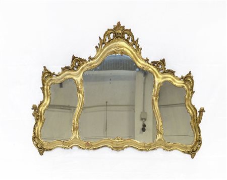 Specchiera tripartita in legno intagliato e dorato a volute, due braccia portac