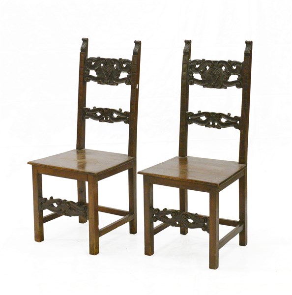 Coppia di sedie con schienale e fascia intagliate e traforate a volute fogliate