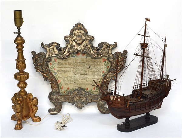 Lotto composto da un candeliere in legno dorato, un cartagloria in rame argentato e un galeone in legno (difetti)
