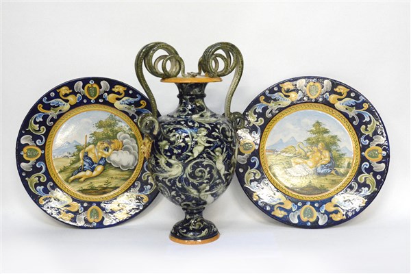 Lotto composto da un vaso biansato marcato Molaroni e una coppa di piatti in ceramica policroma (difetti)