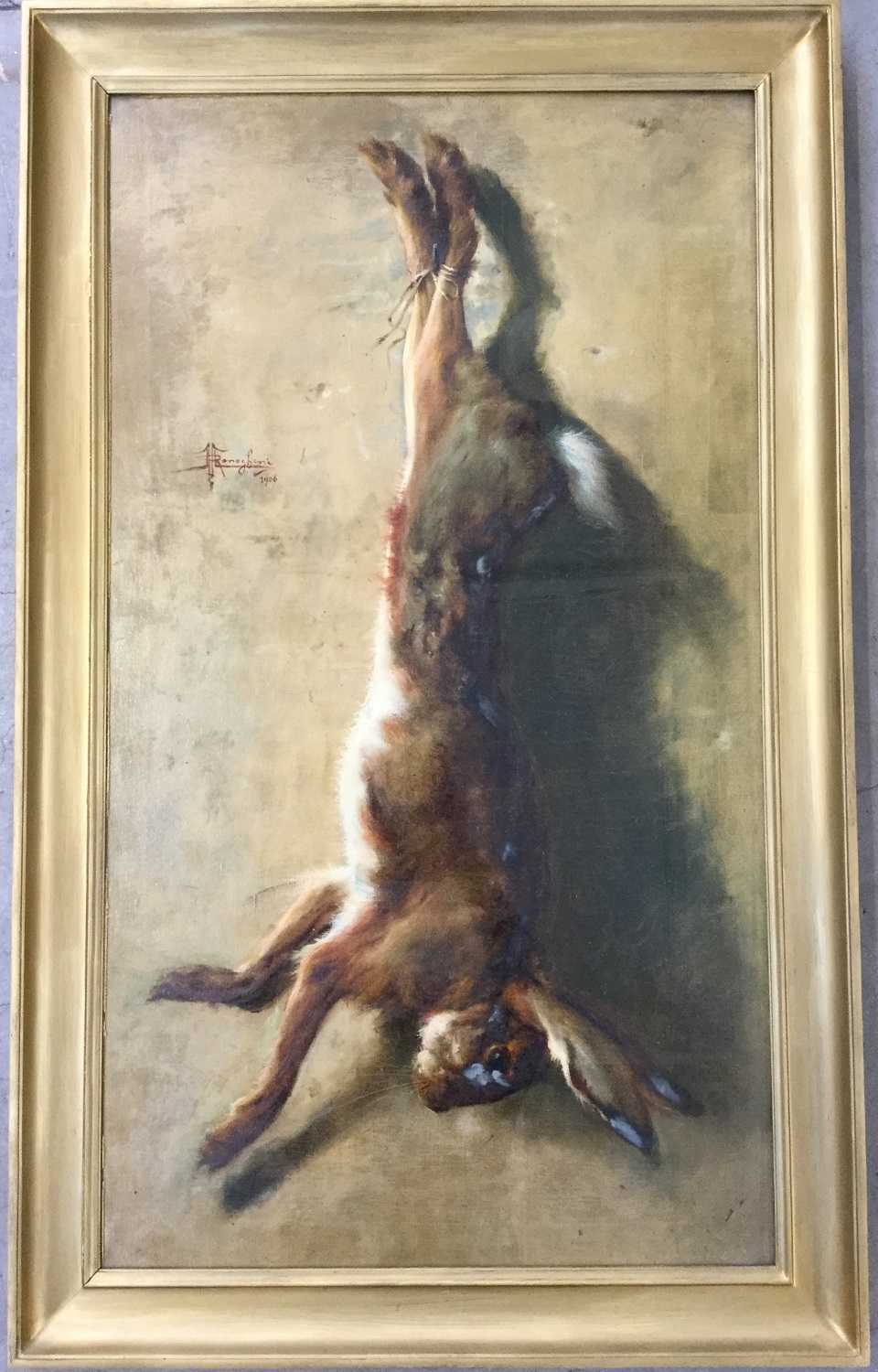"Cacciagione" 1906, olio su tela (cm 105x60) Firmato e datato in alto a sinistra. In cornice