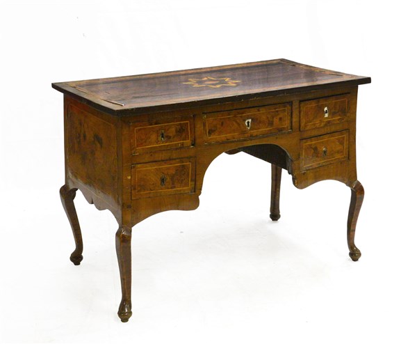 Antico scrittoio in legno intagliato e filettato, fronte a cinque cassetti radicati, piano decorato da motivo geometrico, gambe mosse (cm 118x81x63) (difetti e restauri)