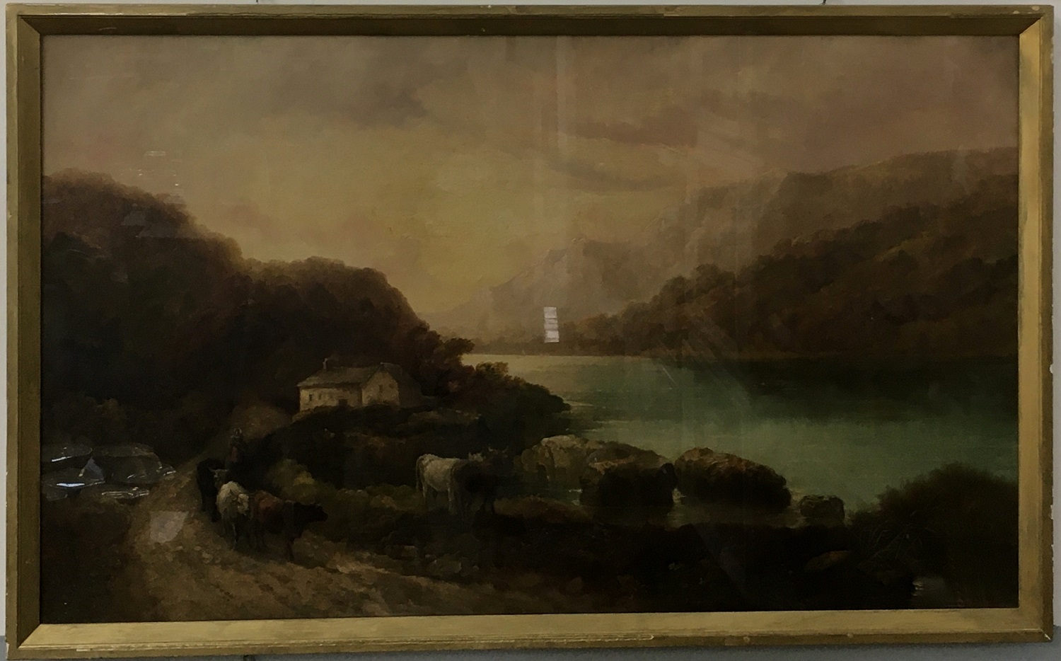 Firma indecifrata "Paesaggio lacustre con figura e armenti" olio su tela (cm 75x125) Firmato in basso a sinistra. In cornice (difetti)