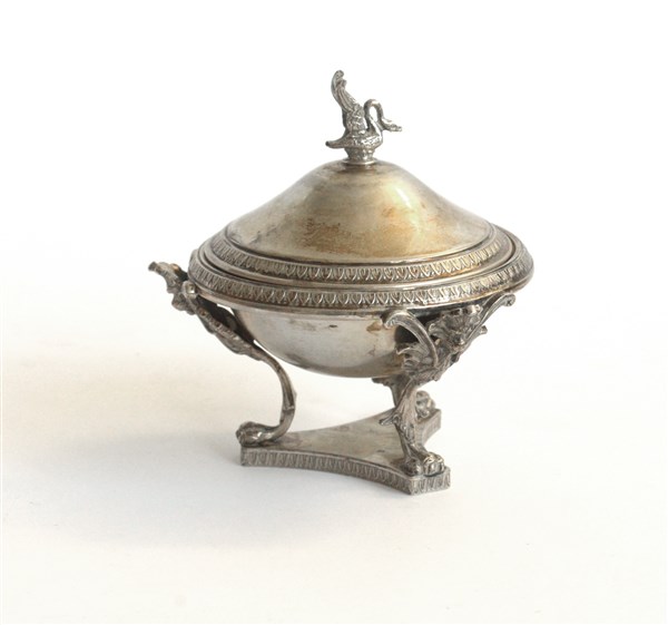 Zuccheriera in stile Impero in argento con presa sormontata da cigno e montanti