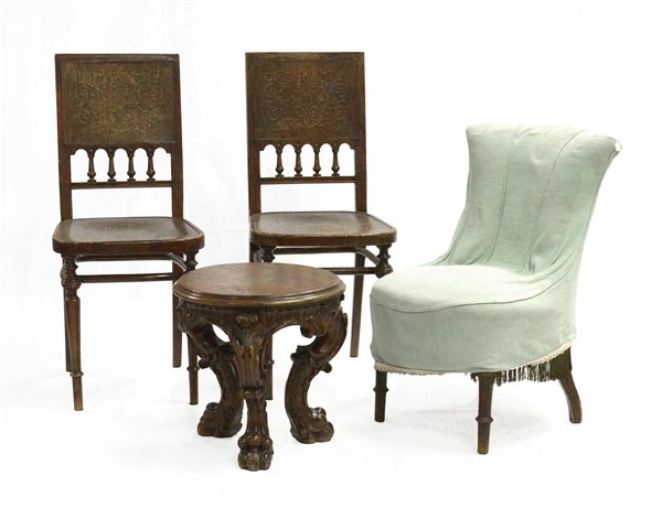 Lotto composto da due sedie, uno sgabello e una poltrona da camera (difetti e m