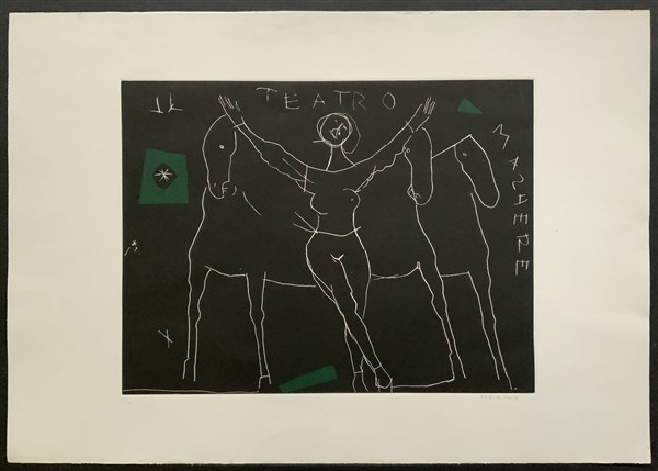 iscritta PA e firmata in basso a matita, timbro a secco "Il Cigno Stamperia d'Arte" in basso a destra; dalla serie "Il Teatro delle Maschere" tavola II