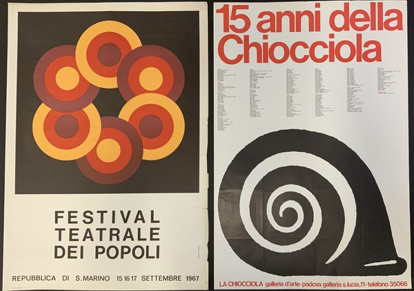 Lotto composto da due manifesti espositivi: "Festival Teatrale dei Popoli" Repubblica di San Marino, 1967 con grafica di Gianfranco Valentini e "15 anni della Chiocciola" Galleria d'arte Padova