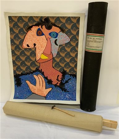 tubo in cartone contenente una serigrafia dell'artista, firmata e numerata 733/1200 (cm 73x58), una cornice smontata, dei chiodini e un piccolo martello