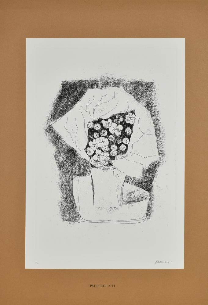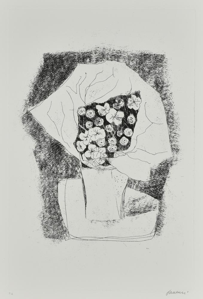 - CARTOCCIO DI FIORI, acquaforte su carta, battuta cm 50x32; es. prova d'autore; firma