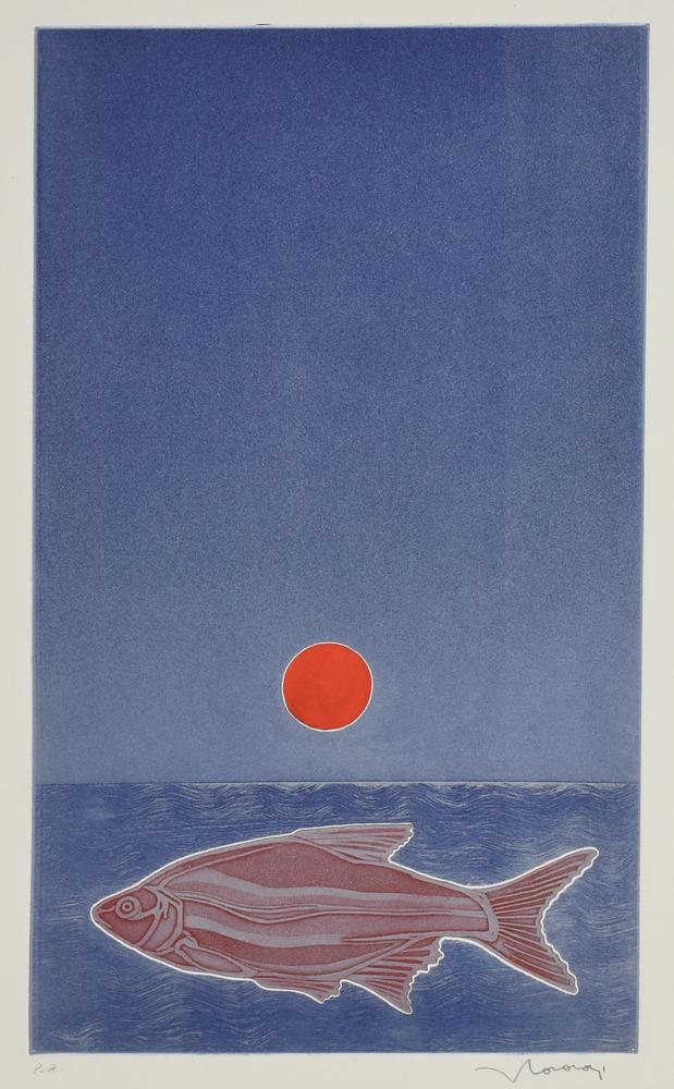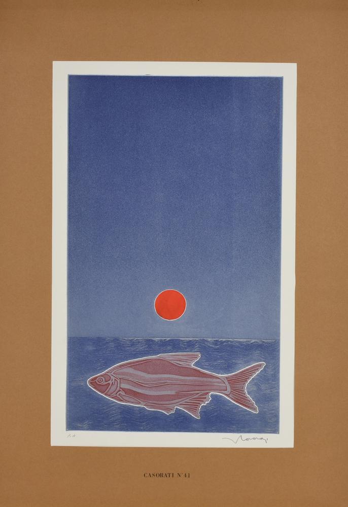 - PESCE E SOLE ROSSO, acquaforte/acquatinta su carta, battuta cm 49x29; es. prova d'autore; firma