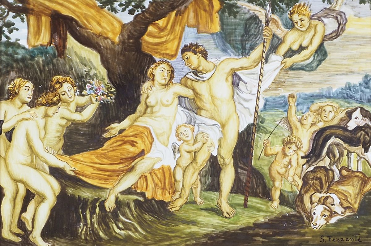 S. Ferrante Piastrella dipinta raffigurante scena nel bosco, cm. 20x30.