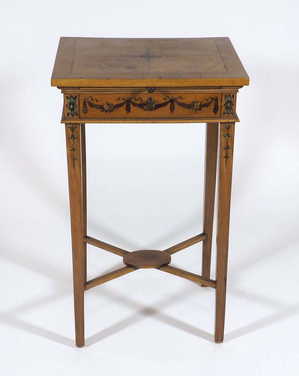Tavolino rettangolare in legno chiaro con cassetto, decorato con pitture policrome a festoni.